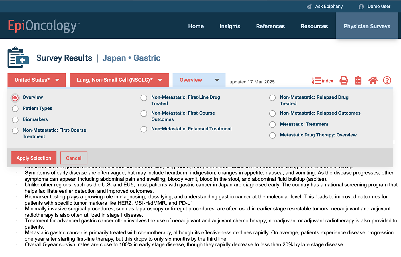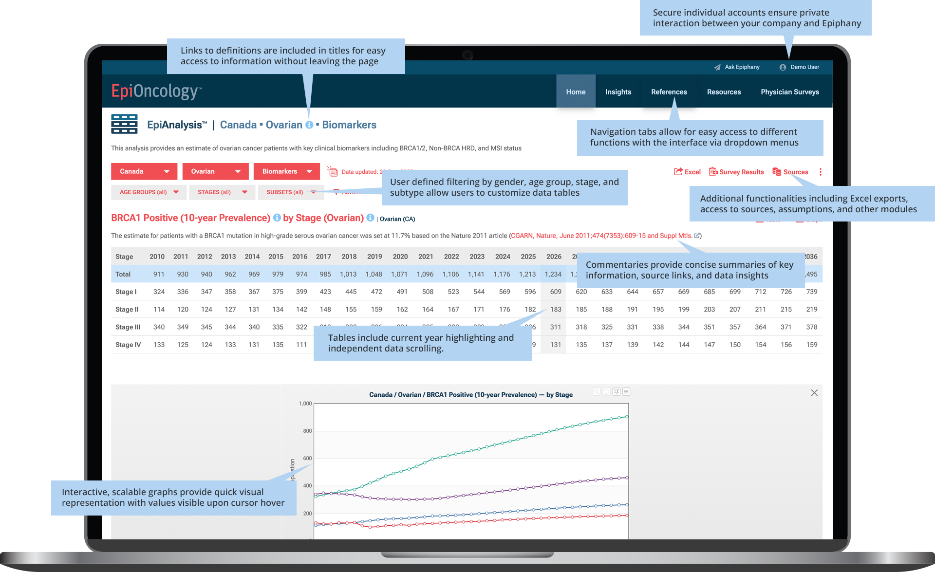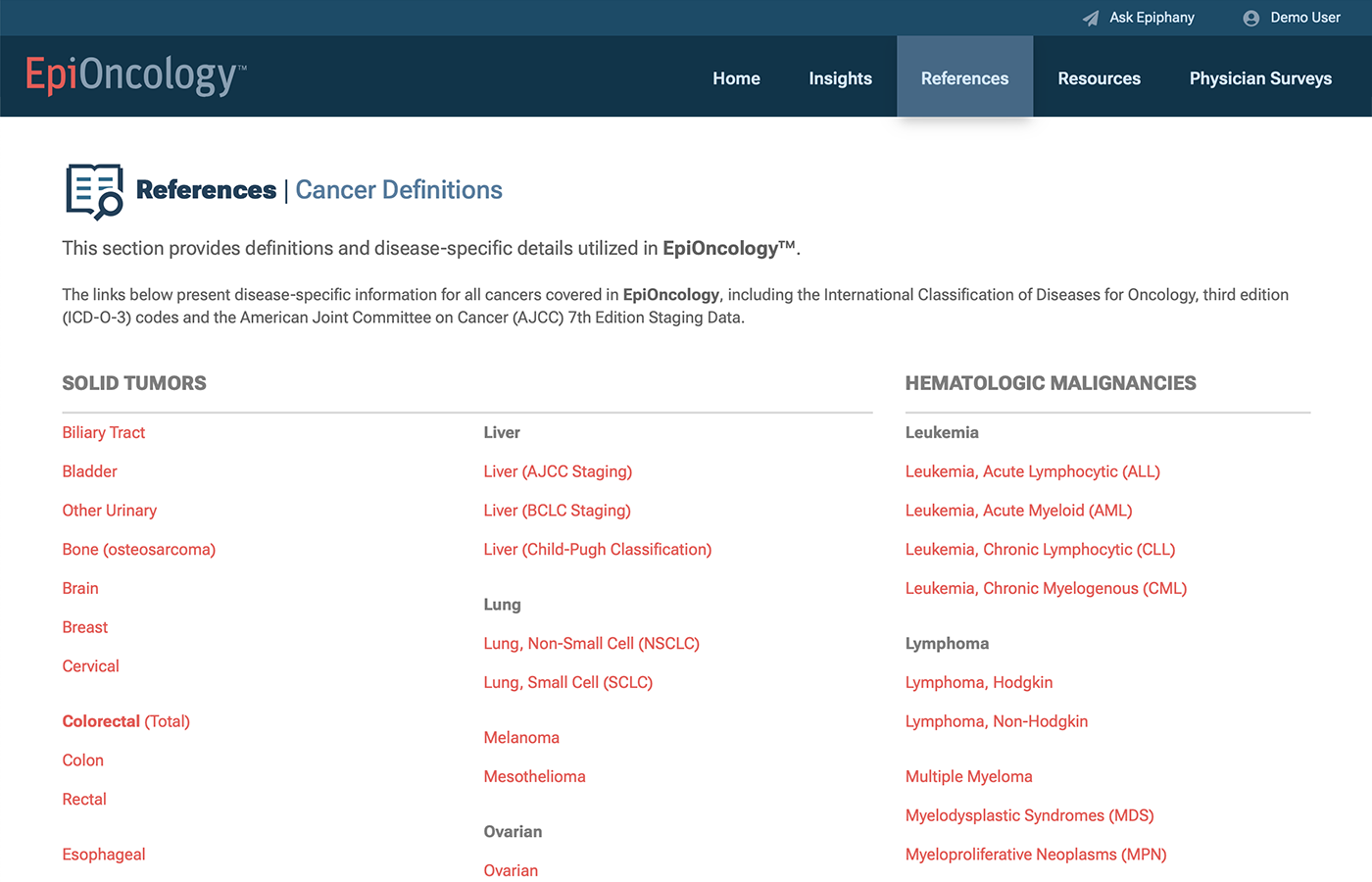 The EpiOncology™ platform contains several distinct features: EpiAnalyses, EpiFlow Diagrams, Physician Surveys, Insights, and References. Each feature provides a critical component for working with our cancer data sets.